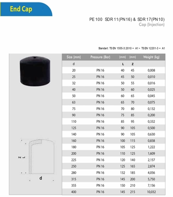 الوصف هي قطعة تستخدم في نهاية الخط لغلق المواسير والأنابيب يستخدم مع المواسير (HDPE) لشبكات المياة والري والصرف الصحي والحريق Project navigationPreviousPrevious project:بردهNextNext project:وصلة تي متساوية