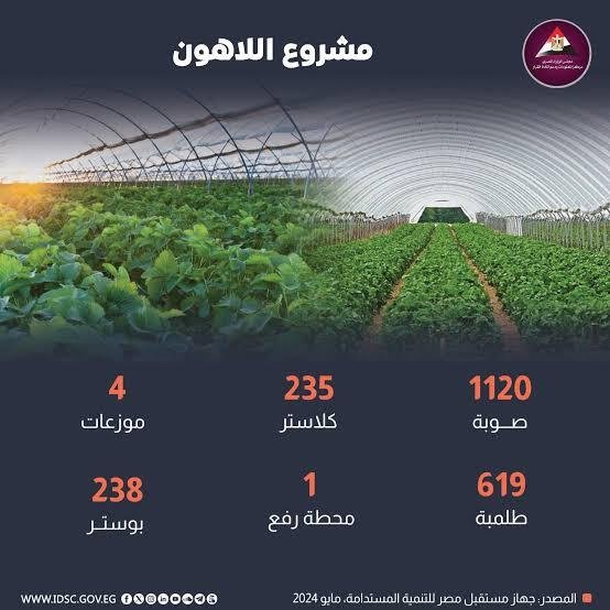A land of 13 thousand feddans has been prepared in El-Lahun, El-Fayoum, and it contains 2000 medium-technology greenhouses. The area of a single greenhouse is 2.5 feddans, which is designed and manufactured by the company’s engineers and a group of national companies with a sorting capacity of 800 tons/day, and a refrigerated storage capacity of 1800 tons. They are sufficient for the consumption of 2.7 million citizens with the aim of contributing to the provision of basic food commodities to citizens.